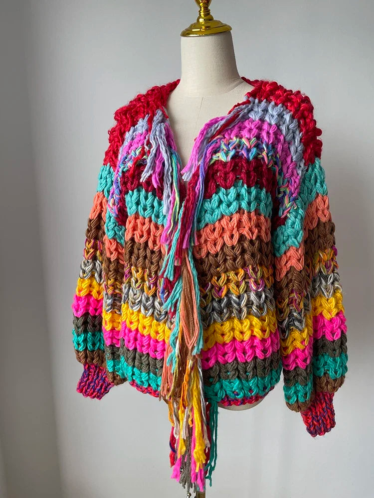 Experience the perfect blend of warmth and style with our vibrant, eclectic sweater. Adorned with multi-colored tassels, this knitted piece not only offers a cozy fit but also makes a bold fashion statement. Its unique design allows for easy layering, ensuring you stay comfortable and chic in any setting. Elevate your wardrobe with this eye-catching sweater that promises to turn heads and keep you snug all season long.
